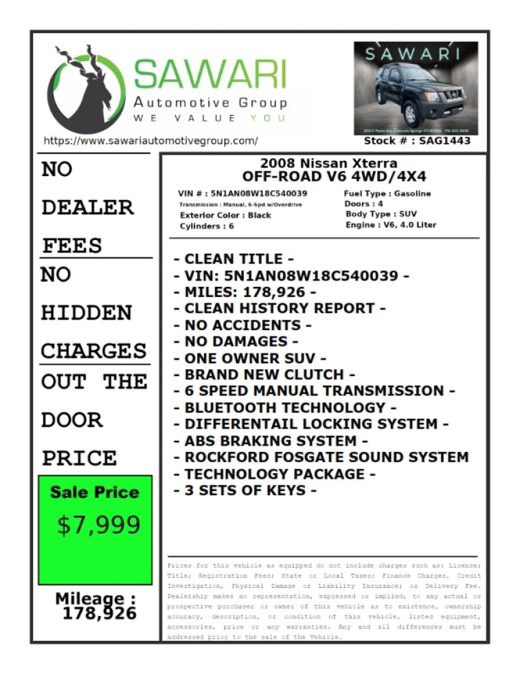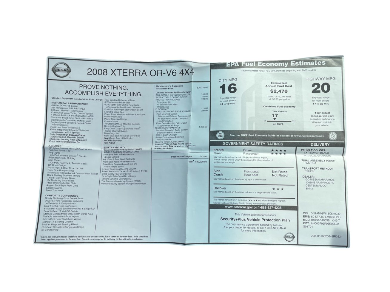 The 2008 NISSAN XTERRA OFF-ROAD V6 4WD/4X4 MANUAL TRANSMISION is available for sale. It is a Clean Title with a Clean History Report. It is a ONE OWNER Off-Road vehicle.