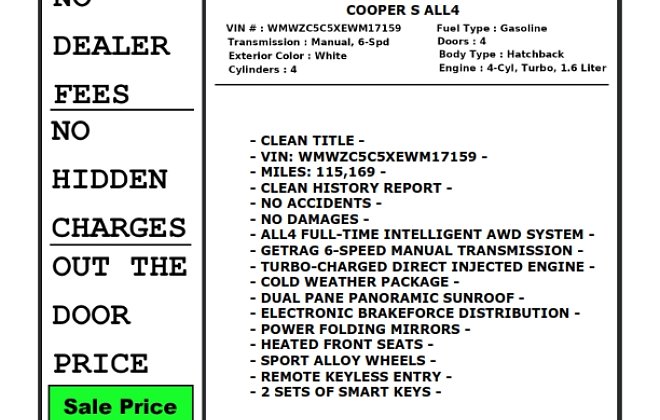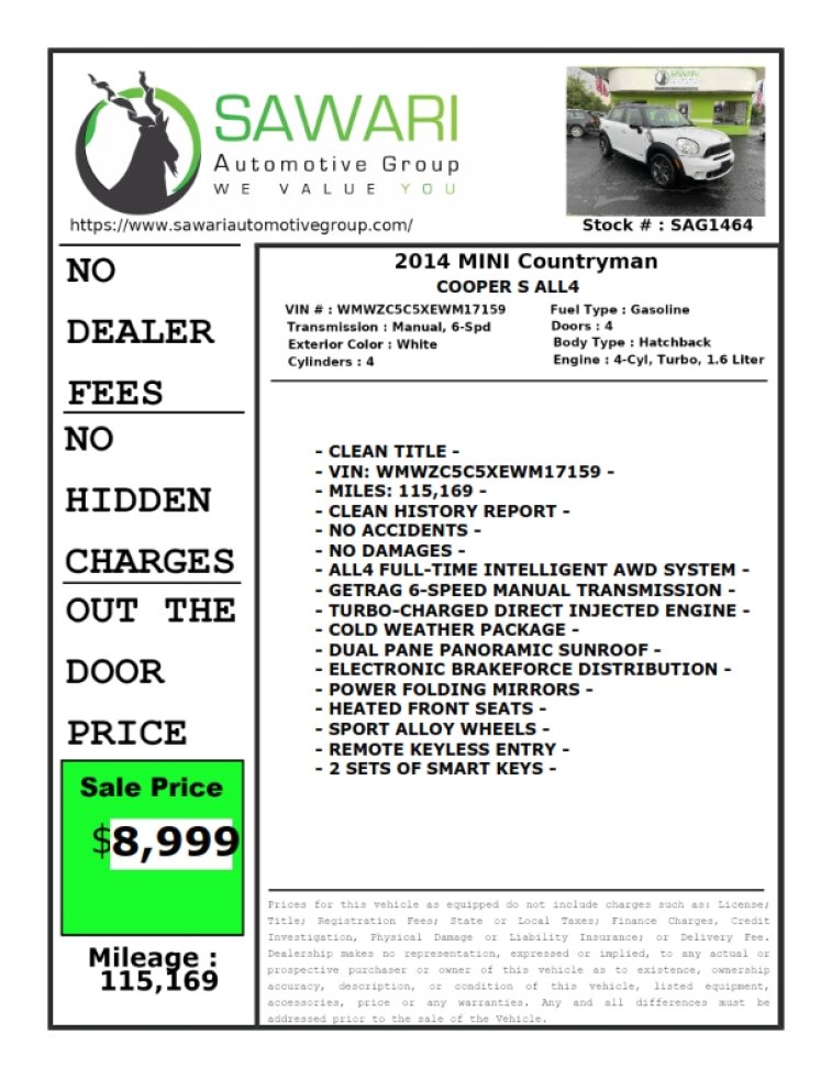 The 2014 MINI COOPER S COUNTRYMAN ALL4 AWD is up for sale. It is a Clean Title with a clean history report. It is in great shape and has an amazing rating on various automobile forums.