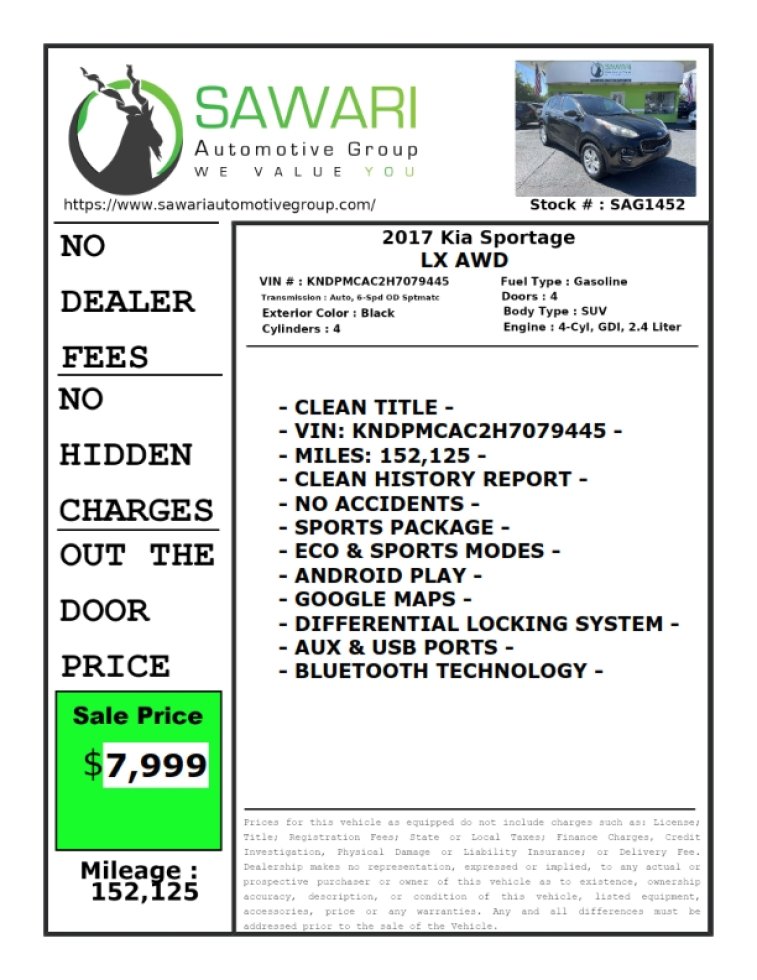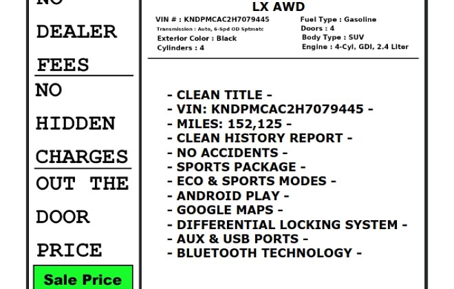 The 2017 KIA SPORTAGE LX AWD is up for sale. It is a Clean Title with a Clean History Report.